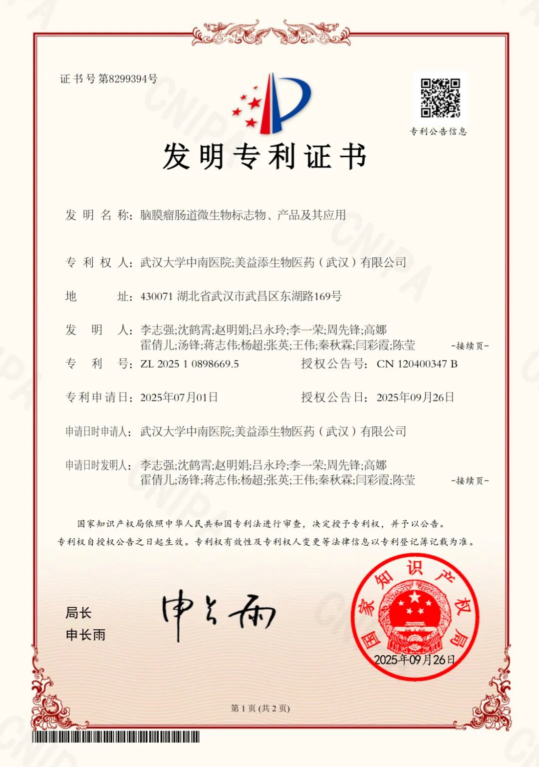 2007.com太阳集团与武汉大学中南医院合作研发的 《脑膜瘤肠道微生物标志物、产品及其应用》,正式获得中国家知识产权局颁发的发明专利证书 !